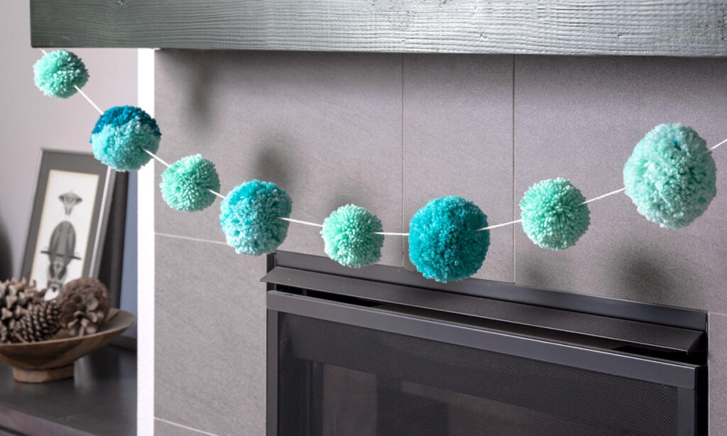Pom-poms are one of my favorite ways to use up leftover yarn. And they’re not just for hats – pom-poms make great decoration items too. You can display them in a bowl as I’ve done above, or use them for gift wrap or garland, as shown below!
