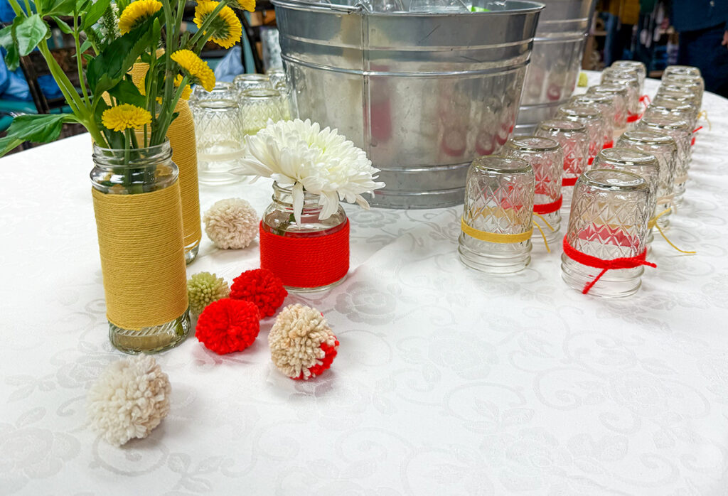 This idea comes courtesy of my good friend Alex who creates beautiful tablescapes. And she came up with some clever ways to incorporate yarn into the table decor for a local yarn shop event I had earlier this year. These yarn-wrapped vases and glasses were so perfect (and love the sprinkling of pom-poms on the table too!).