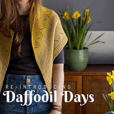 Just in time for daffodil season, my shawl pattern Daffodil Days has been re-released! Originally published as part of a Spring collection with Fairmount Fibers (the distributor of Manos del Uruguay yarns), this pattern has been completely revamped and is now available in my own Ravelry store (as well as here on my website and Lovecrafts).