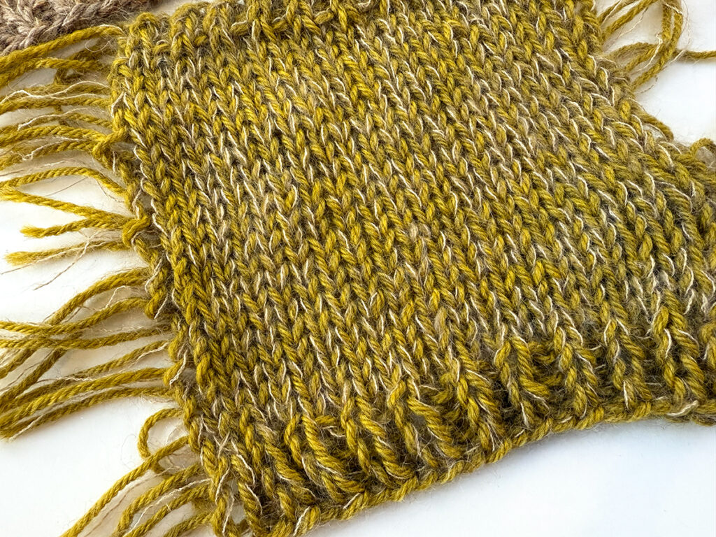 I did the below swatch where I combined 1 strand of Berroco Vintage (a wool/acrylic blend in worsted-weight) with 2 strands of Berroco Aerial (the lace-weight mohair), in 2 different colors: