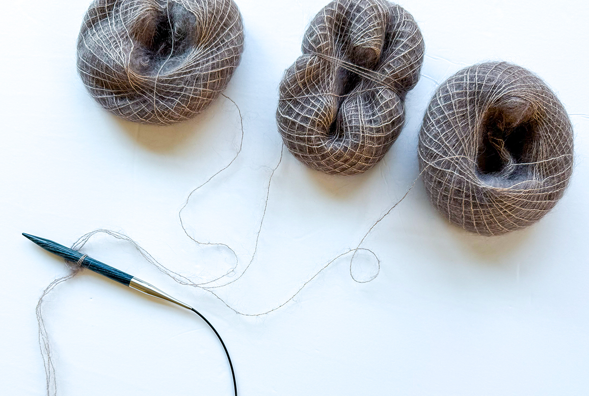 One common method to create 2 strands out of 1 ball is to pull from both the outside and inside of a ball/skein. However, I wouldn’t recommend doing this with a mohair lace like Aerial for a couple of reasons. One, due to the fuzzy nature of the yarn it’s hard to find the inner strand! Also (again due to the fuzziness), you’re more likely to encounter tangling issues this way. So for these reasons, I’d suggest using 3 separate balls and dividing a single ball into 3 parts when/if needed.