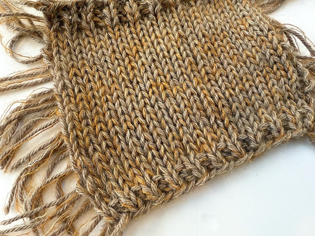 I did the below swatch where I combined 1 strand of Berroco Vintage (a wool/acrylic blend in worsted-weight) with 2 strands of Berroco Aerial (the lace-weight mohair), in 2 different colors: